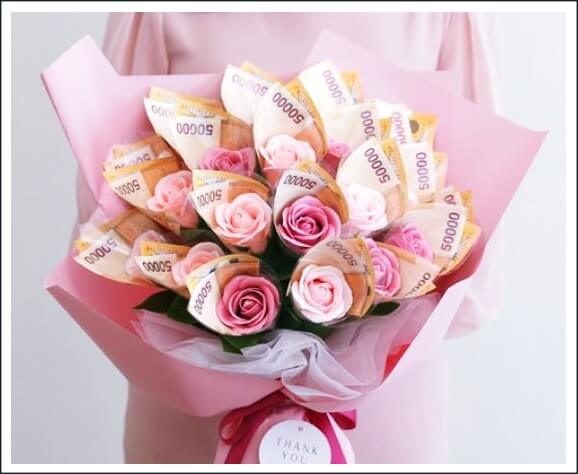 이건 제가 직접 시어머님 생신선물로 백만 원을 담아 선물하였는데요. 돈을 꽃다발에서 뺄 때 어머님의 얼굴에서 미소가 가시지 않습니다. 돈 빼는 재미가 솔솔 합니다. 돈만 주시기 뭣할 때 사용하시면 좋습니다. 꽃은 조화라서 오랫동안 보관 가능합니다.