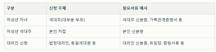 ✔️ 미성년 자녀만 세대주가 대신 신청 수령 가능하며,