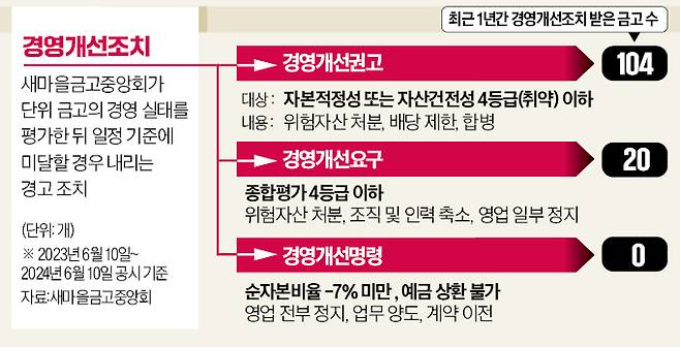 - 경영개선권고가 이행이 되지 않을 경우 경영개선요구로 이어진다고 하는데요. 경영개선요구 이후는 근무인원감축, 분점폐쇄, 통합, 업무 일무 정지등이 이루어지며 이도 제대로 이행이 되지 않을 경우 최악의 상황에는 영업이 정지될 수도 있는데요.