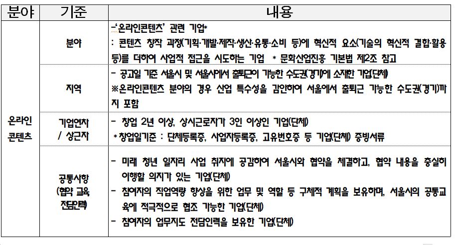 · 온라인콘텐츠, 소셜벤처 분야 (2133-4307, rlarkdd@seoul.go.kr)