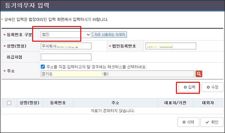 · 등기의무자의 상호(명칭)와 주민등록번호(법인번호) 입력해 주면 됩니다.