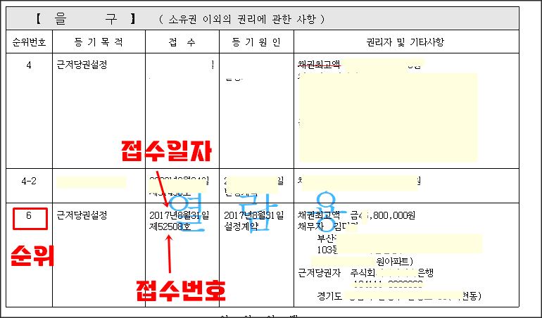 · 순위 : 권리관계 순위를 말합니다.