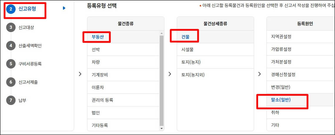 신고유형 : 부동산 -> 건물(본인의 해당물건에 맞게 체크) -> 말소(일반)를 누른 후 다음 페이지로 이동