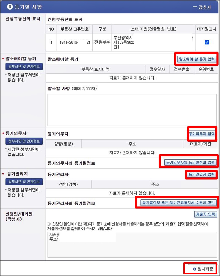위의 인터넷으로 접수할 때 등기권리자 부분에 부부공동명의는 두 사람 모두 입력을 해야 합니다. 혹, 입력을 빠뜨렸다면 등기소 방문 시 수기로 작성할 부분을 알려주니 추가기입을 하면 됩니다.