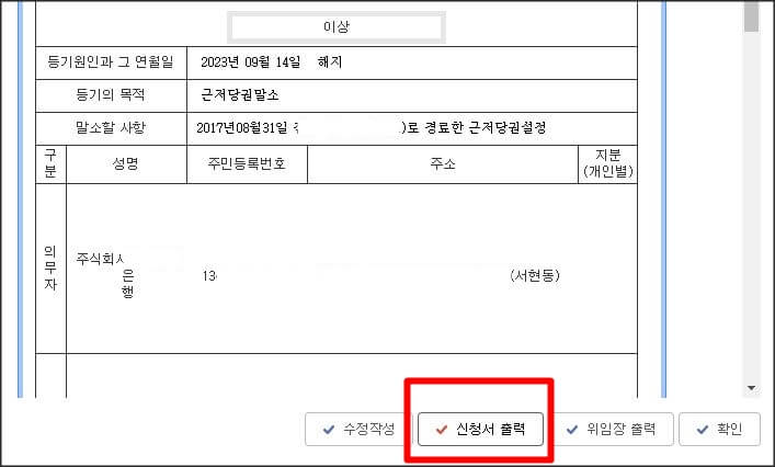 - 인터넷으로 신청이 완료한 후 근저당권 말소 등기신청서를 출력하면 됩니다.