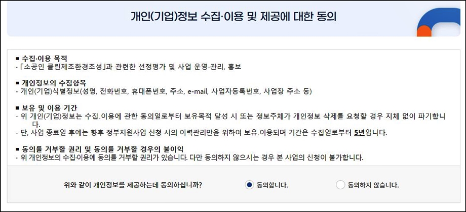 사업자번호를 확인하면 위와 같은 개인정보 수집에 관한 동의화면이 나타납니다.