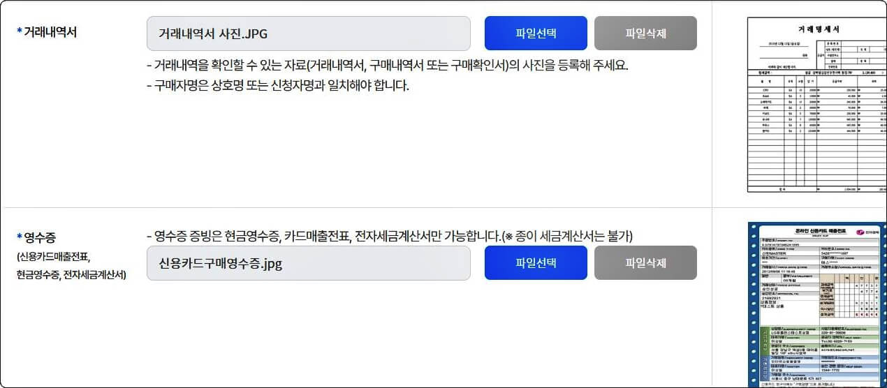 영수증은 [카드매출전표 전자세금계산서, 현금영수증]등의 자료를 첨부하면 됩니다.