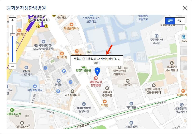| 주소 | 도로명주소 : (04517) 서울특별시 중구 통일로 92 케이지타워 (1, 2, 8층) 지번주소 : 서울특별시 중구 순화동 1-170 경찰청 맞은편-> 케이지타워 |