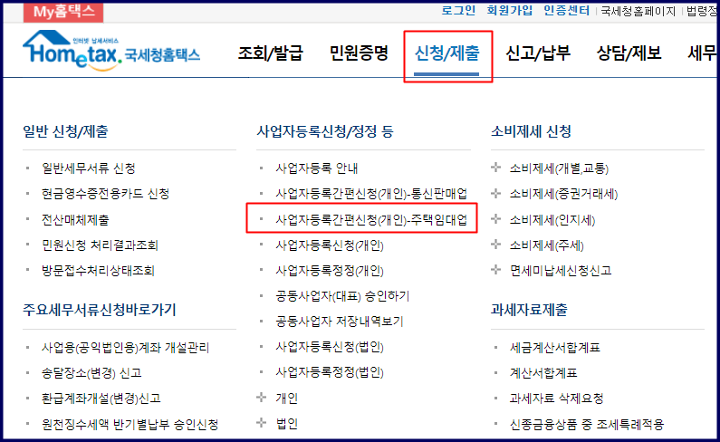홈택스 바로가기 클릭 -> 공인인증 로그인->메인(홈) 신청/제출 -> 사업자등록 간편 신청-주택임대업 클릭하세요