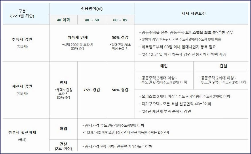건설사 : 기준시가 수도권 6억 원 이하, 비수도권 3억 원 이하, 국민주택규모이하(85)