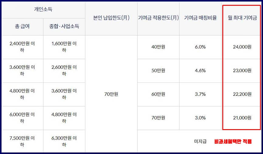 - 총 급여 기준에 따라 월 기여금한도가 21000원~24000원 정도입니다. 아래표에서 확인 가능합니다.