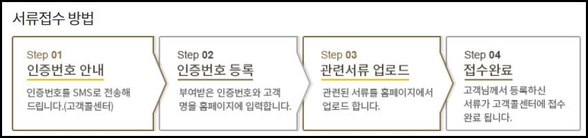 · 절차 : 고객콜센터 1544-0114로 전화 -> 문자로 인증번호 전송 -> 홈페이지에 인증번호 입력 -> 구비서류 업로드 -> 접수완료