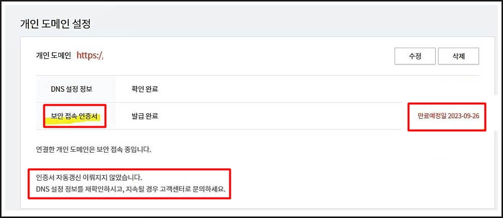개인도메인을 삭제하고 다시 신청을 하니 오류가 해결이 되었습니다.