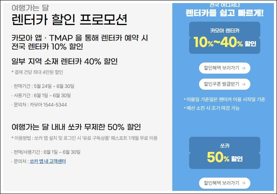 - 카모아 앱, 쏘카 앱에서 렌터카 예약 시 전국 렌터카 10%~50% 할인을 해 준다고 합니다.