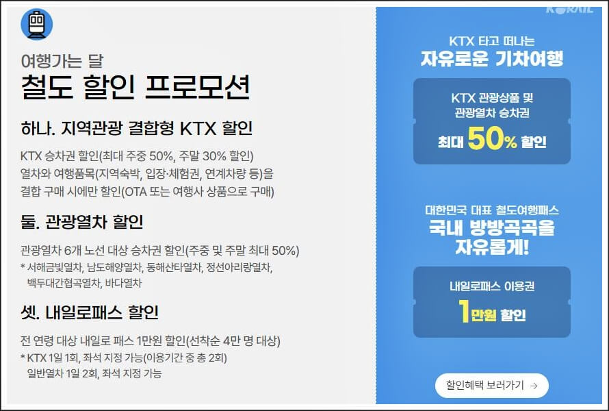 아래 할인권 바로가기 버튼을 누르시면 KTX에서 주관하는 국내여행상품을 보실 수 있습니다.